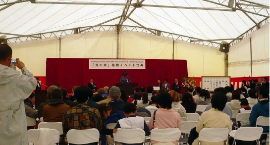 何度もわかりやすく、会場にいる子供たちに訴えかけてました。そして最後に「10年後、今日植えた木を見に来て下さい」と「あななたたちが今日植えたところが、10年後には森になってるからこの”海の森”に来て歩いて下さい。」と・・・。