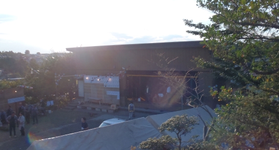 今回の一番難しいところは、メイン会場の模様を他会場でも同時放映することでした。写真には写ってませんがアナログーデジタル変換の器械を使用し100mのLANケーブルで送ることにしました。他会場ではそこから映像と音声を拾いミキサーと分配器でおのおの送出をしました。